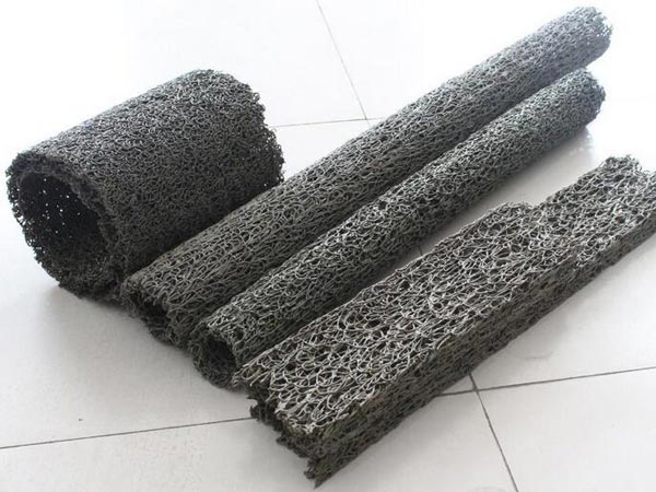 塑料盲溝是由塑料芯體外包裹濾布組式。塑料芯體是以熱可塑性合成樹脂為主要原料,經(jīng)過改性,在熱熔狀態(tài)下,通過噴咀擠壓出細(xì)的塑料絲條,再通過成型裝置將擠出的塑料絲在結(jié)點(diǎn)上熔接,形成三維立體網(wǎng)狀結(jié)構(gòu)。