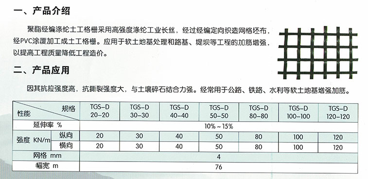 聚酯經(jīng)編滌綸土工格柵采用高強(qiáng)度滌綸工業(yè)長絲,經(jīng)過經(jīng)編定向織造網(wǎng)格坯布,經(jīng)PVC涂覆加工成土工格柵。應(yīng)用于軟土地基處理和路基、堤壩等工程的加筋增強(qiáng),以提高工程質(zhì)量降低工程造價。